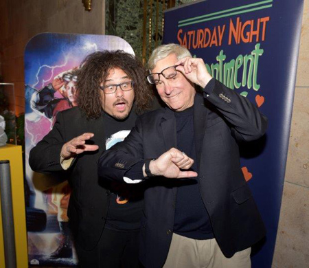DeLorean owner Aaron Gum poses with Bob Gale.