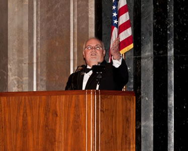 Tim Neal as seen from the back of the theater and the sold out audience.