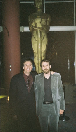 Vanska and Bruce pose on stage under the big screen where film clips